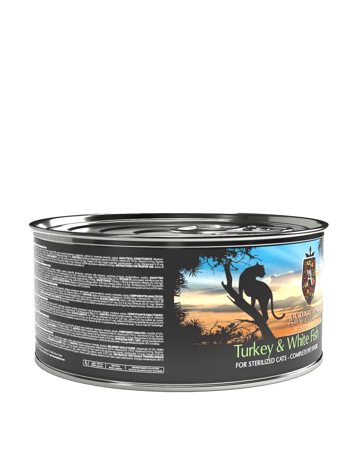 The Ambrosia Turkey & White Fish recipe is a combination of fine turkey & white fish meats, providing a balanced and delicious meal. Specially catered for senior & sterilized cats, it features ideal moisture level and texture making it a mouthwatering and appetizing pleasure for your pet. It’s perfect as a whole meal or as a mix with your cat’s dry food. Ambrosia Turkey & White Fish is a superior grain free cat food that is offering optimal nutrition for your cat.
